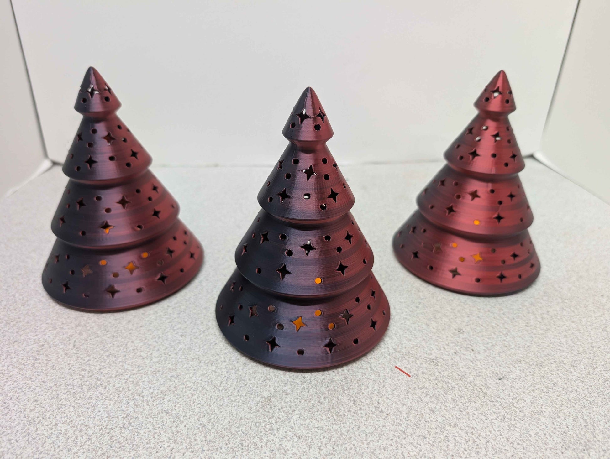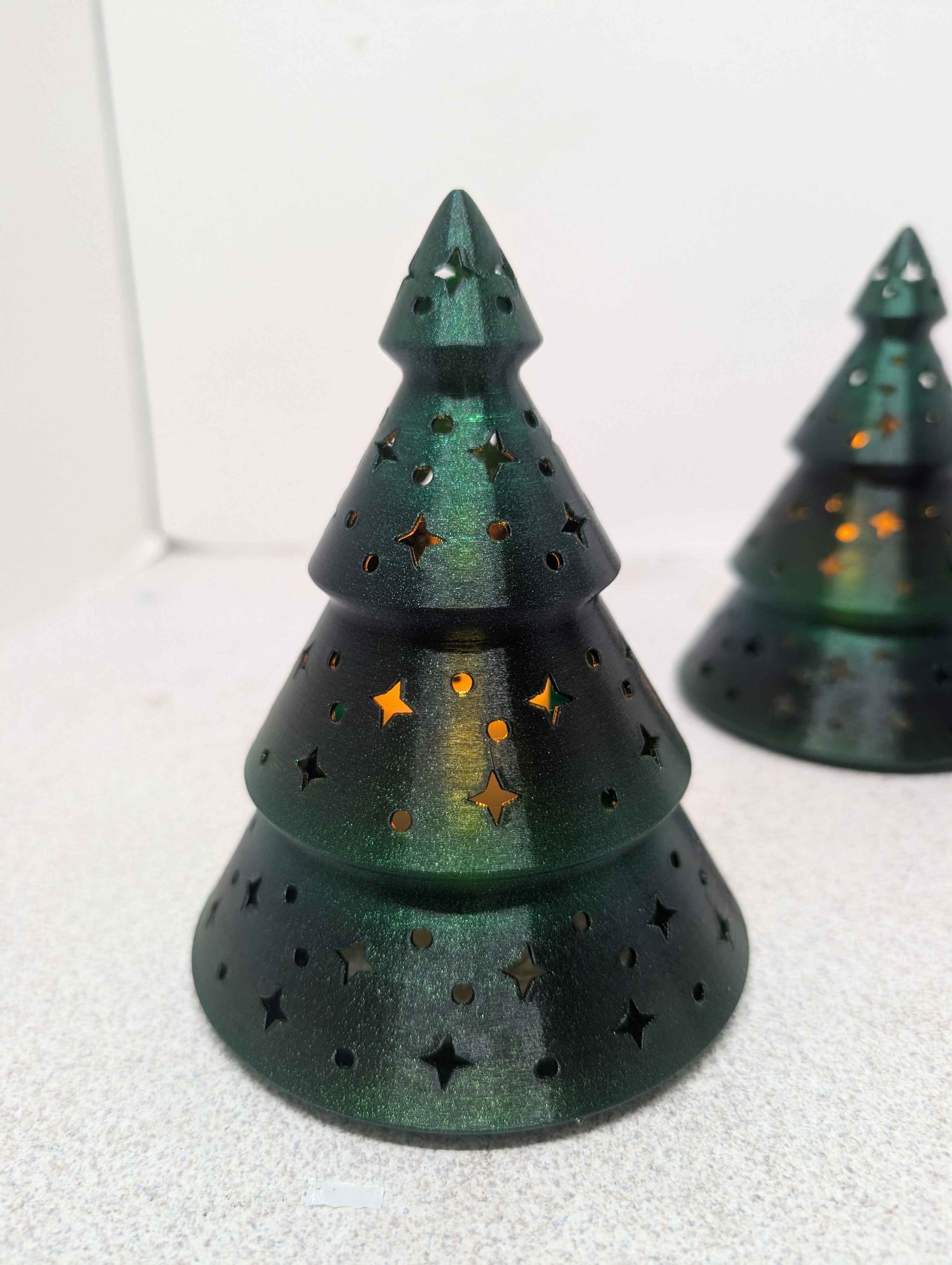 At roughly 6 inches tall, the compact 3D Printed silhouette features layered tiers pierced with star and diamond cutouts that release a warm, lantern-like light. The LED electric candle inside replicates the soft flicker of real candlelight with none of the flame risk, making it safe to place near stockings, children’s spaces, or compact vignettes.